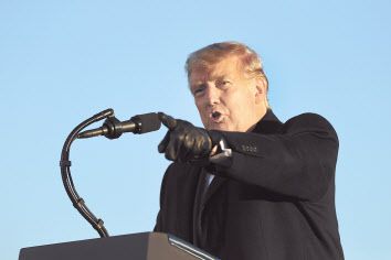 도널드 트럼프 미국 대통령이 27일(현지시간) 위스콘신주 웨스트세일럼에서 유세 연설을 하고 있다. 위스콘신은 4년 전 대선에서 트럼프 대통령이 치열한 경합 끝에 승리한 곳이지만 최근 신종 코로나바이러스 감염증(코로나19) 사태가 확산되면서 부정적 여론이 높아지고 있다. [로이터] |