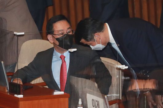 주호영 국민의힘 원내대표가 28일 오전 서울 여의도 국회 본회의장에서 문재인 대통령 시정연설을 앞두고 자리로 찾아온 경호처 직원과 대화를 하고 있다. 청와대 경호처는 대통령과의 사전환담장으로 들어가는 주 원내대표를 몸수색해 물의를 빚었다./이덕훈 기자 |