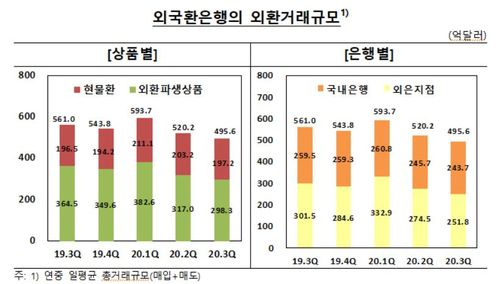 국내은행의 거래 규모는 243억7천만달러로 2.0억달러(0.8%) 줄었다. 외국은행 지점은 251억8천만달러로 22억6천만달러(8.3%) 감소했다.