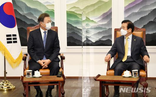 문 대통령은 이날 오전 '2021년도 예산안 시정연설' 전 국회의장실에서 박병석 국회의장을 비롯한 4부 요인, 정당 대표들과의 사전환담 자리에서 "코로나 상황 때문에 그동안 만나서 대화할 만한 여건들이 서로 간에 조금 어려웠던 측면이 있었다"며 이같이 말했다.