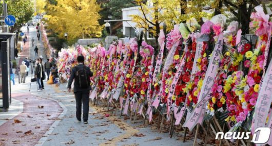 28일 오후 서울 서초구 대검찰청 앞 거리에 윤 총장 지지자들이 보낸 화환이 늘어서 있다. /사진=뉴스1 |