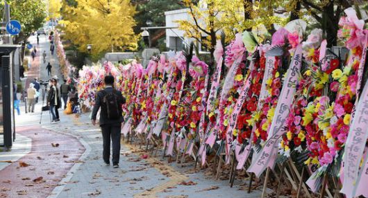 현재 대검 일대에 340여개 화환이 놓여 있다. 대법원 정문에서 대검을 지나 서울 서초경찰서 직전까지 늘어서 있고, 맞은편에도 고검 후문부터 지검 정문 앞까지 윤 총장을 응원하는 화환들로 가득찼다.