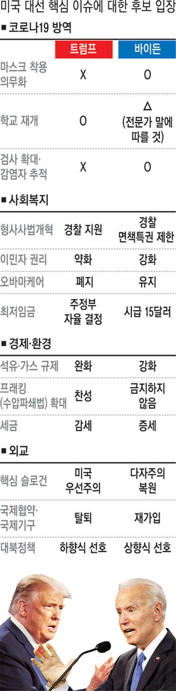 최근 일주일간 미국의 코로나19 감염자가 50만명 더 늘었지만, 트럼프 대통령은 “코로나19가 사라지고 있다”고 주장한다. 마스크 착용 의무화에 반대하고, 봉쇄 완화와 학교 재개를 추진한다. 또 코로나19 백신을 긴급 승인해 미국인에게 우선 제공하겠다고 밝혔다. 바이든 전 부통령은 마스크 의무화에 찬성한다. 연방정부 예산을 들여 코로나19 검사와 감염자 추적을 지원하겠다고 밝혔다. 학교 재개에 반대하지는 않지만, 봉쇄 기준을 마련하겠다고 밝혔다. 공중보건 전문가에게 결정권을 주고, 과학자의 말을 듣겠다고 했다.
