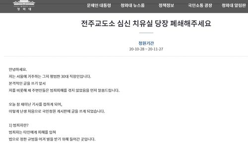 29일 청와대 국민청원 게시판에는 '전주교도소 심신 치유실을 당장 폐쇄해 주세요'라는 제목의 글이 올라왔다.
