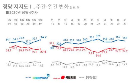 21대 국회에서 진행된 첫 국정감사에서 추미애 법무부 장관과 윤석열 검찰총장의 갈등이 드러나면서 양당 지지층이 결집한 것으로 해석된다. 다만 민주당 지지율은 1.6%포인트 올랐지만, 국민의힘 지지율은 0.3%포인트 상승하는데 그쳤다. 이로 인해 양당 격차는 9.1%포인트로 벌어졌다.