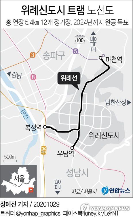 (서울=연합뉴스) 김계연 기자 = 위례신도시 트램 사업이 정부 승인을 받았다. 서울시는 내년에 공사를 시작해 2024년까지 완공할 계획이다.