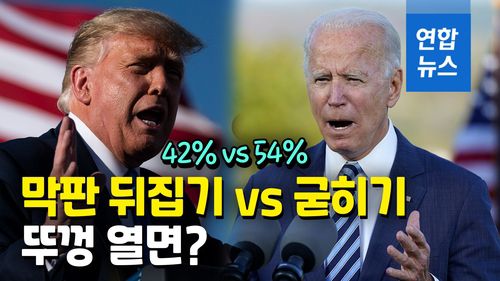 (서울=연합뉴스) 11월 3일 미국 대선이 임박한 가운데 민주당의 조 바이든 후보가 공화당 후보인 도널드 트럼프 대통령에 큰 차이로 앞서고 있다는 여론조사 결과가 나왔습니다.