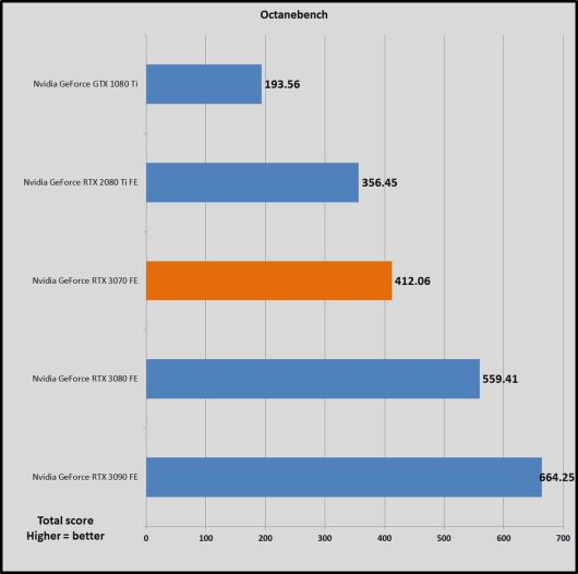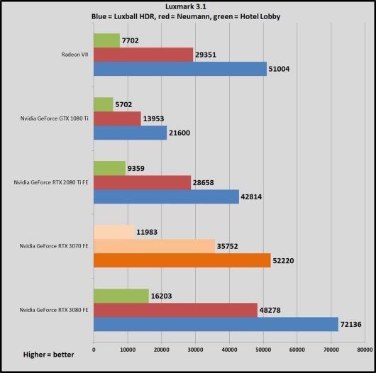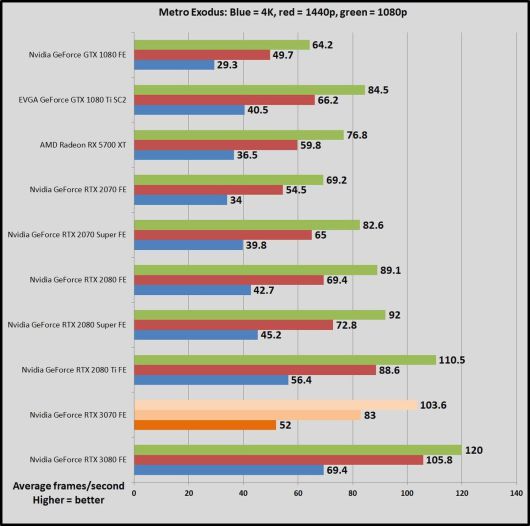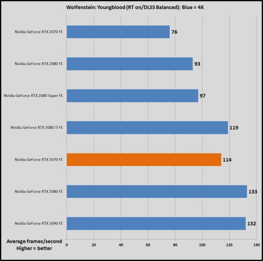 가격이 500달러로 같은 이전 세대 지포스 RTX 2070과 비교하면, GPU 작업에서 RTX 2070이 45~69% 더 느리다. 한 세대만에 비약적으로 발전한 것이다(RTX 2070은 비슷한 가격의 GTX 1080보다 많이 빠르지 않았다). RTX 3070은 강력한 성능 덕분에, 1440p, 심지어 4K 해상도에서도 레이트레이싱을 켜서 게임을 즐길 수 있다. 이 상태에서도 상당히 뛰어난 프레임률을 구현할 수 있다. RTX 2070은 이 정도는 아니었다.