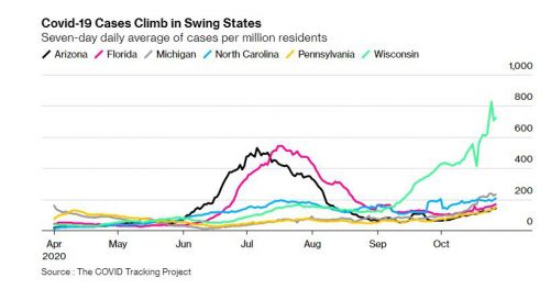 특히 경합주에서 코로나19 확진자와 입원자 수가 치솟고 있어 트럼프 지지자들이 투표를 하지 못할 가능성마저 커지고 있다. 트럼프 대통령은 그동안 “우편투표는 사기”라며 11월 3일 현장투표를 장려해왔다. 그러나 팬데믹이 위스콘신, 미시간, 펜실베이니아를 포함한 중서부와 인근 지역에서 들불처럼 번지고 있다. 지난주 위스콘신주는 1인당 코로나19 발생률이 미국 주 가운데 3위를 기록했다. 미시간과 펜실베이니아의 7일간 평균 확진자 증가율도 각각 25%, 33%로 나타났다.