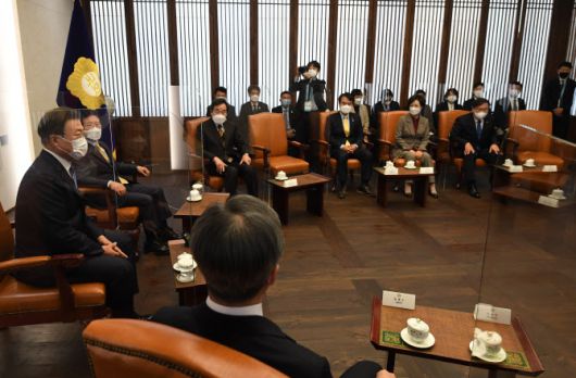 문재인 대통령이 28일 오전 국회 시정연설에 앞서 국회의장실에서 박병석 국회의장과 각 당 지도부, 김명수 대법원장, 정세균 국무총리 등과 환담하고 있다. 문 대통령은 이 자리에서 인사청문회 개선안을 국회에 요청했다.(사진=연합뉴스) |
