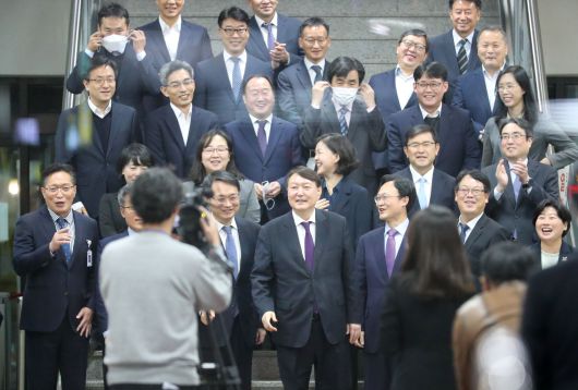 윤석열 검찰총장이 29일 오후 대전 서구 대전고등검찰청을 방문해 검사들과의 간담회를 마친 뒤 청사 로비에서 검사들과 기념촬영을 하며 환하게 웃고 있다./뉴시스 |