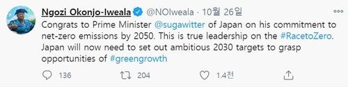 오콘조이웨알라 후보는 WTO 사무총장 후보자에 대한 선호도 조사가 진행되던 지난 26일 "일본 스가 총리의 2050년까지 이산화탄소 등 온실가스 배출량을 제로(0)로 하겠다고 약속한 데 축하한다"면서 "이는 진정한 리더십"이라고 추켜세웠다.