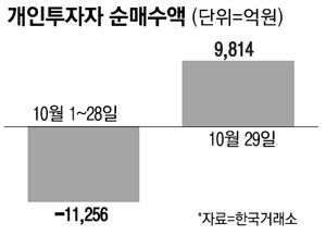 이날 유가증권시장에서 개인투자자는 9814억원을 순매수했다. 이는 지난 9월 22일 9912억원을 순매수한 뒤로 한 달여 만에 최대 규모다. 이달 들어 전날까지 개인투자자는 1조1256억원을 순매도했지만 29일 하루 만에 매도 물량을 다시 흡수했다. 최근 들어 개인투자자는 27일 1069억원, 28일 1532억원을 순매수하면서 매수세로 돌아서는 흐름을 보였다. 27~29일 3거래일 동안 개인투자자는 유가증권시장에서만 1조2400억원을 순매수했다.