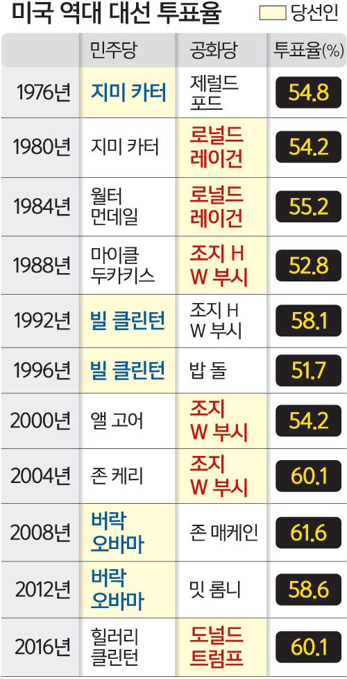 1970년대 이후 역대 미국 대선에서 투표율이 가장 높았던 선거는 민주당의 버락 오바마 후보와 공화당의 존 매케인 후보가 맞붙었던 2008년 대선으로 61.65%를 기록했다. 오는 11월 3일의 대선일을 5일 남겨놓은 28일까지 사전 투표자는 7300만명에 이르러 2016년 대선 전체 투표수의 53%를 넘었다고 워싱턴포스트가 보도했다. 특히 경합 주에서 거센 사전 투표 열풍이 불고 있다. 지난 대선 당시 전체 투표와 비교할 때 이날까지 사전 투표 비율은 텍사스 91%, 조지아 77%, 노스캐롤라이나 76%, 플로리다 72%, 애리조나 68% 등으로 집계됐다.