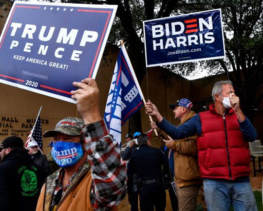 보수 텃밭서도 접전 조 바이든 미국 민주당 대선후보 지지자(오른쪽)와 도널드 트럼프 대통령을 지지하는 유권자가 28일(현지시간) 보수 공화당 텃밭인 텍사스 애빌런의 한 공원에 모여 손 팻말을 든 채 바이든 캠프 유세 차량을 기다리고 있다. 애빌런=AP연합뉴스 |