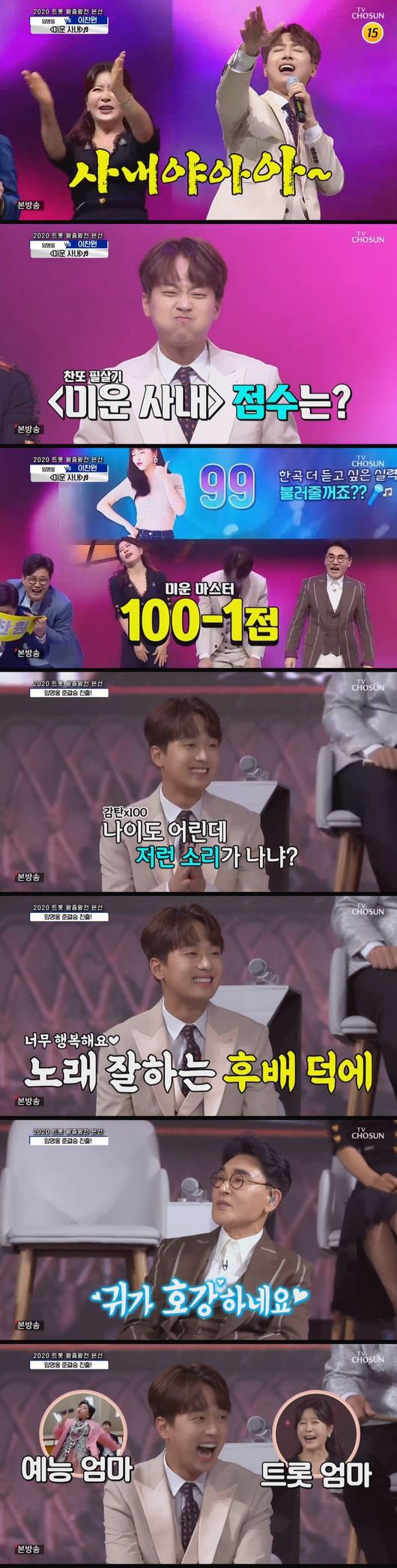 이찬원은 "나도 백점 맞을 것"이라면서 유지나의 '미운 사내'를 선곡했다. 모두의 기대 속에서 이찬원은 아깝게 1점을 못 얻고 99점을 획득, 임영웅이 준결승 4강에 진출했다.