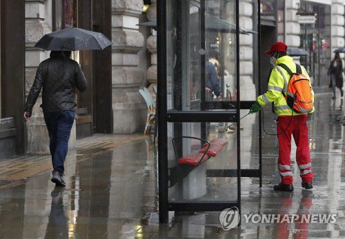 런던 버스 정류장의 방역 작업 모습 [AP=연합뉴스] |