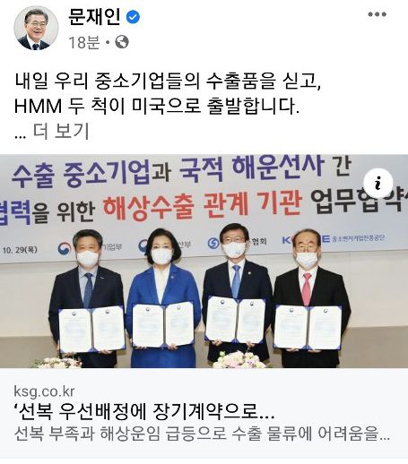문 대통령은 이날 페이스북 등 SNS에서 관련 기사를 링크하며 “기업의 수출 애로를 해소하기 위해 관계 부처가 매우 신속하게 전방위로 뛴 결과”라며 이같이 밝혔다. HMM은 31일 중소기업 수출을 돕기 위해 미국으로 향하는 4500∼5000TEU(1TEU는 6m짜리 컨테이너 1개)급 선박 2척을 추가로 투입할 예정이다.