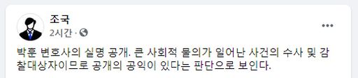 조 전 장관도 이날 박 변호사의 글이 올라온 직후 공유해 게시물을 주변에 알렸다. 그는 “박훈 변호사의 실명공개. 큰 사회적 물의가 일어난 사건의 수사 및 감찰 대상자이므로 공개의 공익이 있다는 판단으로 보인다”고 했다.