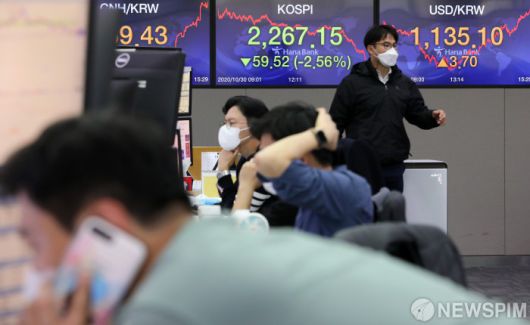 [서울=뉴스핌] 백인혁 기자 = 30일 오후 코스피 지수가 전 거래일 대비 59.52포인트(2.56%) 내린 2,267.15에 마감했다. 코스닥 지수는 21.28포인트(2.61%) 내린 792.65에 장을 마쳤고 달러/원 환율은 3.7원 오른 1,135.1원에 종료했다. 이날 서울 중구 하나은행 딜링룸에서 딜러들이 업무를 보고 있다. 2020.10.30 dlsgur9757@newspim.com