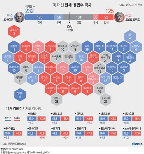 (서울=연합뉴스) 이윤영 기자 = 미국 대선이 다가올수록 누가 승자가 될 것인지 예측하기가 더 어려워지고 있다. 여론조사 결과 전국 단위로는 조 바이든 민주당 후보가 도널드 트럼프 대통령을 여전히 앞서고 있지만 경합주에서는 두 후보의 격차가 계속 좁혀지거나 박빙으로 나타나고 있기 때문이다.