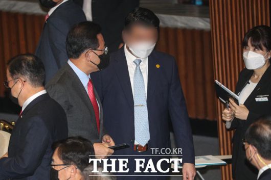 -그게 국회 본관 민주당 대표실 앞에서 입니다(웃음). 논란이 된 후 최 수석이 가져가지 않았던 '주호영 원내대표 10대 질의·답변'이라고 인쇄된 종이를 취재기자들에게 촬영해달라고 요청했다고 합니다. 주 원내대표 앞에선 안 가져왔다는 뉘앙스로 말한 뒤 나중에 기자들에게 답변서를 가져왔지만, 공개된 자리여서 전달 못 했다고 한 겁니다.