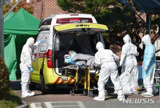 [광주(경기)=뉴시스] 김종택기자 = 신종 코로나바이러스 감염증(코로나19)이 집단 발생한 경기 광주시 SRC 재활병원에서 18일 오후 관계자들이 확진자를 이송하고 있다. 2020.10.18. jtk@newsis.com |