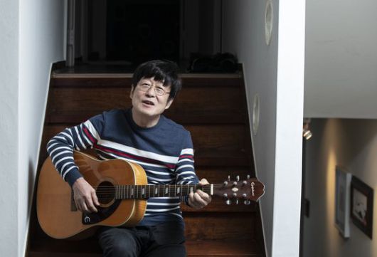 인터뷰 내내 기타를 쥐고 있던 그는 자연스럽게 연주를 이어갔습니다. ‘노인의 벤치’는 지난 18일 발매된 솔로 앨범 ‘문’의 타이틀곡입니다. 1983년 ‘기타가 있는 수필’ 발매 이후 “일기 쓰듯이, 달력 넘기듯이 만들면 되겠지” 하고 미뤄뒀다가 37년이 걸린 솔로 앨범입니다. 내겐 여신 같던 그녀를 다시 만난 노인은 “아침에 일어나 틀니를 들고 잠시 어떤 게 아래쪽인지 머뭇거리는 나이”(‘시간’)가 되어 나지막이 조언을 건넵니다.