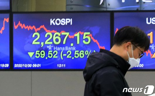 30일 오후 서울 중구 하나은행 명동점 딜링룸 전광판에 코스피 지수가 전 거래일 대비 59.92p(2.56%) 내린 2,267.15를 나타내고 있다. 이날 코스닥 지수는 전 거래일 대비 21.28p(2.61%) 내린 792.65, 원·달러 환율은 3.70원 오른 1,135.10원으로 장을 마감했다. 2020.10.30/뉴스1 © News1 강수련 기자 |