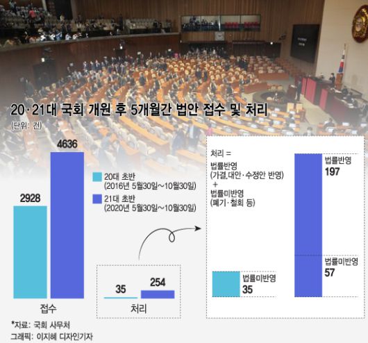 20대 국회 초반과 대조적이다. 2016년 5월 30일부터 10월 30일까지 접수된 법안 건수는 2928건으로 21대 초반 대비 63.2%에 그쳤다.