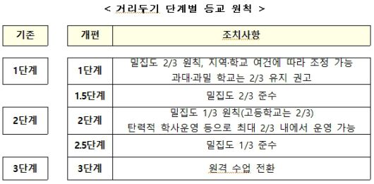 다만 학사운영 조정에 있어 기존 거리두기 단계에서의 조정 경험과 역량을 고려하고, 학교현장의 혼란을 최소화하기 위해 기존 3단계 체제를 최대한 유지한다.