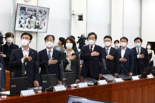 더불어민주당 이낙연 대표가 29일 오후 국회에서 열린 제19차 온택트 의원총회에서 국민의례를 하고 있다. 뉴시스 |
