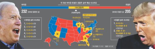 트럼프 대통령이 지난 대선에서 승리한 30개주 가운데 경합주 6곳을 뺀 24곳에서 모두 승리한다면 205명의 선거인단을 확보하게 된다. 바이든 전 부통령이 경합주 6곳을 제외하고 클린턴 후보가 2016년 대선 때 이긴 곳에서 모두 승리한다면 232명을 얻게 된다. 선거 승리를 위한 매직넘버(270명)를 채우기 위해선 표심이 유동적인 경합주에서 최대한 많은 선거인단을 긁어모아야 한다.