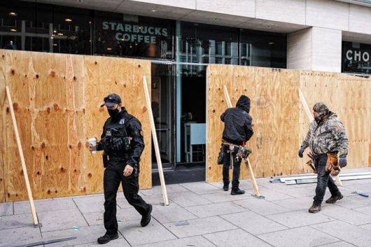 스타벅스 앞에도… 워싱턴 상가들 나무 방어막 - 미국 대선을 사흘 앞둔 10월 31일(현지 시각) 워싱턴DC 백악관 인근에 있는 상가에서 인부들이 나무로 된 안전판을 설치하고 있다. 워싱턴과 뉴욕 등 미국 주요 도시에서는 대선 전후 시위를 우려해 안전판을 설치하는 상가가 늘어나고 있다고 CNN은 전했다. /로이터 연합뉴스 |