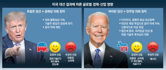 트럼프 대통령이 재선에 성공할지, 바이든 후보가 정권 교체에 성공할지에 따라 세계 무역질서와 산업별 수혜 업종이 달라질 것으로 예상된다. 특히 개표 지연 및 선거 결과 불복이 현실화할 경우 세계 금융시장이 크게 요동칠 수 있다는 우려도 나온다.