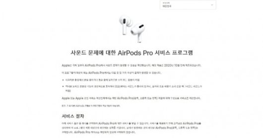 2일 업계에 따르면, 애플은 지난달 30일 자사 홈페이지를 통해 “극히 일부의 에어팟 프로에서 사운드 문제가 발생할 수 있음을 확인했다”며 “해당 제품은 2020년 10월 전에 제조됐다”고 밝혔다.