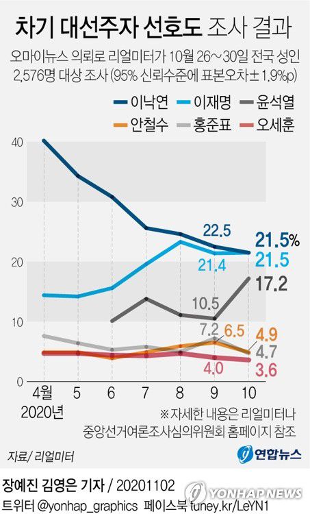 리얼미터가 오마이뉴스 의뢰로 지난달 26∼30일 전국 성인 2천576명을 대상으로 조사한 결과 윤석열 총장에 대한 선호도는 전월보다 6.7%포인트 오른 17.2%로 집계됐다.