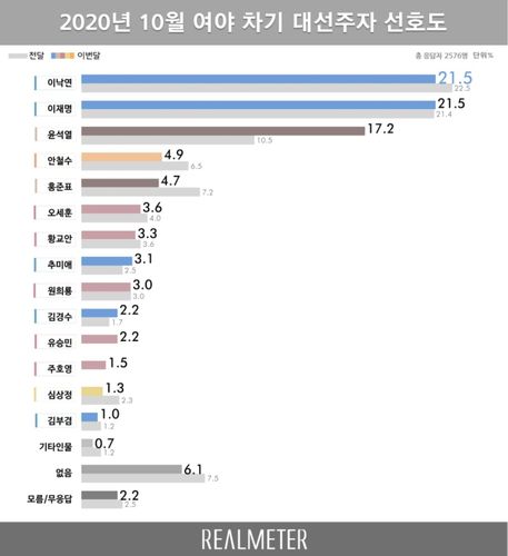 이어 국민의당 안철수 대표(4.9%), 무소속 홍준표 의원(4.7%), 오세훈 전 서울시장(3.6%), 황교안 전 미래통합당 대표(3.3%), 추미애 법무부 장관(3.1%), 원희룡 제주지사(3.0%), 김경수 경남지사(2.2%), 유승민 전 의원(2.2%), 국민의힘 주호영 원내대표(1.5%), 정의당 심상정 전 대표(1.3%), 민주당 김부겸 전 의원(1.0%) 순으로 집계됐다.