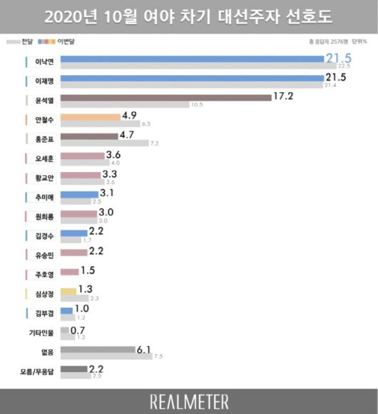 이어 안철수 국민의당 대표(4.9%), 홍준표 무소속 의원(4.7%), 오세훈 전 서울시장(3.6%), 황교안 전 미래통합당 대표(3.3%), 추미애 법무부 장관(3.1%), 원희룡 제주지사(3.0%), 김경수 경남지사(2.2%), 유승민 전 의원(2.2%), 주호영 국민의힘 원내대표(1.5%), 심상정 정의당 전 대표(1.3%), 김부겸 민주당 전 의원(1.0%) 순으로 집계됐다.