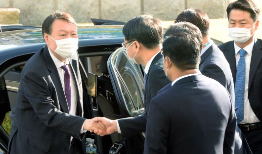 윤석열 검찰총장이 지난 10월 29일 오후 대전 서구 대전고등검찰청을 방문해 강남일 대전고검장과 이두봉 대전지방검찰청장 등과 악수하고 있다. /오종찬 기자 |