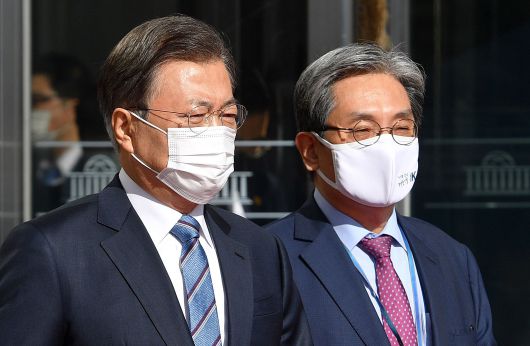 문재인 대통령이 28일 오전 국회 본회의에서 2021년도 예산안 시정연설을 마치고 노영민 비서실장 등과 국회 본청을 나서고 있다./이덕훈 기자 |