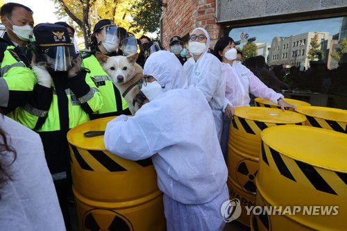(서울=연합뉴스) 김주성 기자 = 환경, 탈핵 단체 회원들로 구성된 '대한민국 방방곡곡 가져가라 핵폐기물 캠페인단'이 2일 청와대 앞 분수대 광장에서 핵폐기물의 위험성을 알리는 퍼포먼스와 기자회견을 하려다 이를 막는 경찰과 대치하고 있다. 캠페인단은 대형 핵폐기물통 모형 여러 개를 분수대 광장으로 옮기려다 경찰에 제지당해 인근 청운효자동 주민센터 근처에서 기자회견을 했다. 2020.11.2