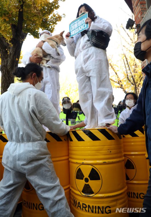 [서울=뉴시스]박영태 기자 = 탈핵 및 환경 관련 시민사회단체 회원들이 2일 오후 서울 종로구 청운동사무소 앞에서 '대한민국 방방곡곡 가져가라 핵폐기물' 기자회견을 하고 있다. 이들은 당초 청와대 앞 분수대광장에서 행사를 할 예정이었지만 경찰의 제지로 청운동사무소 앞에서 기자회견을 진행했다. 2020.11.02.