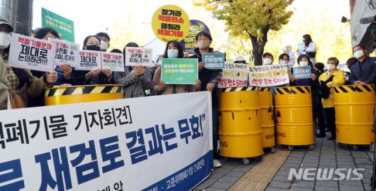 [서울=뉴시스]박영태 기자 = 탈핵 및 환경 관련 시민사회단체 회원들이 2일 오후 서울 종로구 청운동사무소 앞에서 '대한민국 방방곡곡 가져가라 핵폐기물' 기자회견을 하고 있다. 이들은 당초 청와대 앞 분수대광장에서 행사를 할 예정이었지만 경찰의 제지로 청운동사무소 앞에서 기자회견을 진행했다. 2020.11.02.