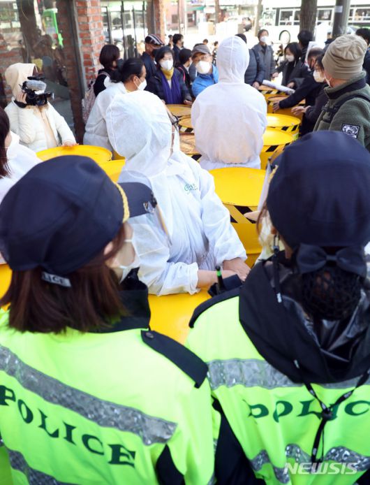 [서울=뉴시스]박영태 기자 = 탈핵 및 환경 관련 시민사회단체 회원들이 2일 오후 서울 종로구 청와대 분수대 앞에서 '대한민국 방방곡곡 가져가라 핵폐기물' 기자회견을 위해 이동하다 청운동 동사무소 앞에서 경찰에 막히고 있다. 이들은 당초 청와대 앞 분수대광장에서 기자회견을 할 예정이었지만 경찰의 제지로 청운동사무소 앞에서 기자회견을 진행했다. 2020.11.02.