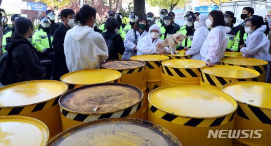[서울=뉴시스]박영태 기자 = 탈핵 및 환경 관련 시민사회단체 회원들이 2일 오후 서울 종로구 청와대 분수대 앞에서 '대한민국 방방곡곡 가져가라 핵폐기물' 기자회견을 위해 이동하다 청운동 동사무소 앞에서 경찰에 막히고 있다. 이들은 당초 청와대 앞 분수대광장에서 기자회견을 할 예정이었지만 경찰의 제지로 청운동사무소 앞에서 기자회견을 진행했다. 2020.11.02.