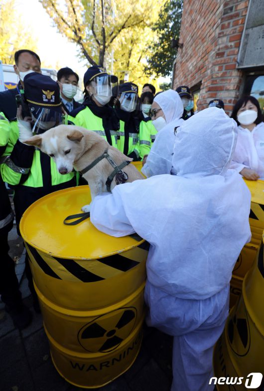 (서울=뉴스1) 이광호 기자 = 대한민국 방방곡곡 가져가라 핵폐기물 캠페인단이 2일 서울 청와대 앞 분수광장에서 핵폐기물의 위험성과 부실, 졸속 공론화 문제를 알리는 퍼포먼스와 기자회견을 하려다 이를 막는 경찰과 대치하고 있다. 캠페인단은 20개의 핵폐기물 드럼통 모형을 분수대 광장으로 옮기려다 경찰의 제지로 청운효자동 주민센터 인근에서 기자회견을 가졌다. 2020.11.2/뉴스1