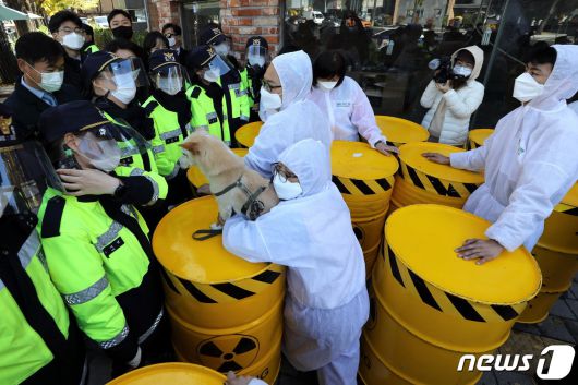 (서울=뉴스1) 이광호 기자 = 대한민국 방방곡곡 가져가라 핵폐기물 캠페인단이 2일 서울 청와대 앞 분수광장에서 핵폐기물의 위험성과 부실, 졸속 공론화 문제를 알리는 퍼포먼스와 기자회견을 하려다 이를 막는 경찰과 대치하고 있다. 캠페인단은 20개의 핵폐기물 드럼통 모형을 분수대 광장으로 옮기려다 경찰의 제지로 청운효자동 주민센터 인근에서 기자회견을 가졌다. 2020.11.2/뉴스1