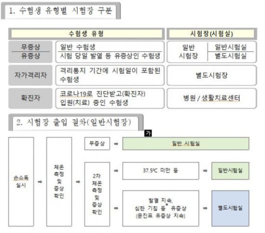 시험장은 일반수험생을 위한 일반시험장(62교 1160실), 자가격리자를 위한 별도시험장(2교 16실), 확진자를 위한 병원시험장 등으로 구분해 운영된다. 병원시험장은 확진자가 발생할 경우 설치할 예정이다.