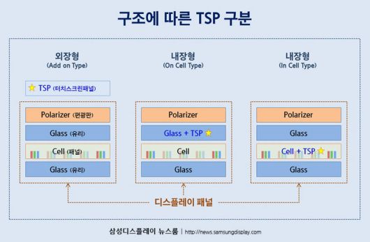 터치일체형은 터치 기능이 내장된 OLED를 뜻한다. 기술적으로는 OLED 패널 속 박막봉지(TFE) 위에 터치센서를 구현한다. 터치일체 OLED는 별도의 필름을 사용하지 않아 디스플레이를 얇게 만들 수 있고, 원가를 절감할 수 있는 것이 장점이다.